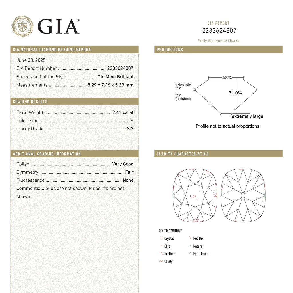 2.41ct 8.29x7.46x5.29mm GIA SI2 H Antique Old Mine Cut 26685-01